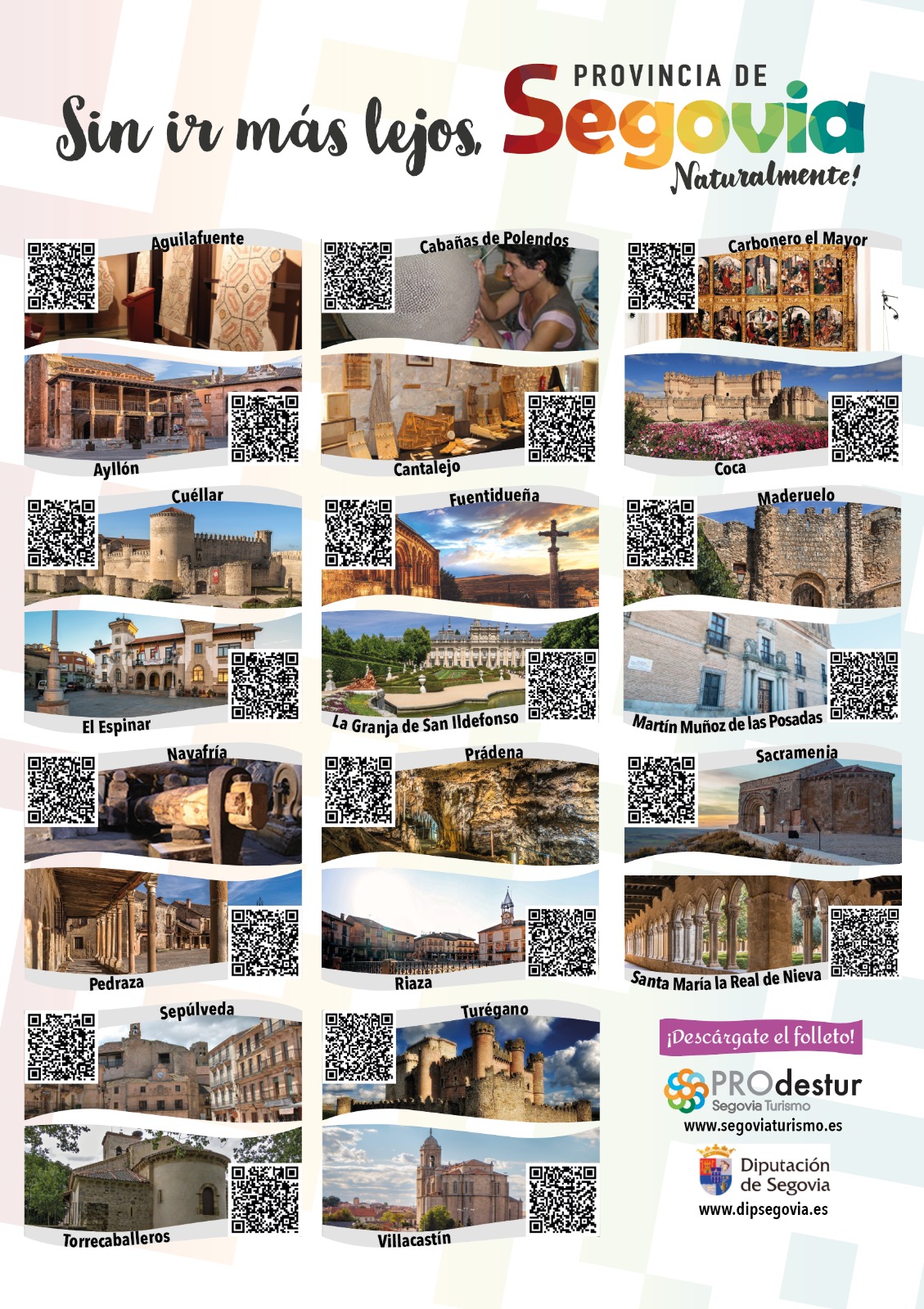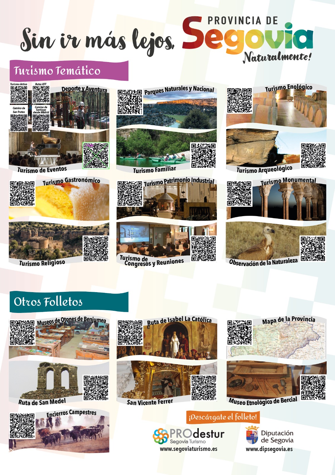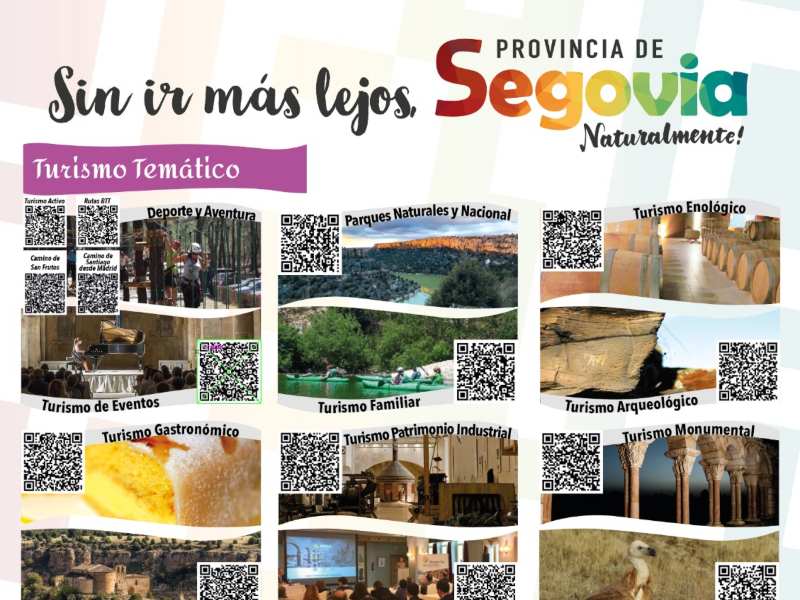 Entre la oferta informativa, figura la relativa a pueblos como Aguilafuente, Carbonero el Mayor, el Real Sitio de San Ildefonso, El Espinar, Maderuelo, Prádena Riaza, Turégano o Villacastín, hasta sumar un total de 22 localidades, mientras que por lo que se refiere al código cuyo contenido dirige a los folletos temáticos, los turistas podrán encontrar propuestas de deporte y aventura, turismo de eventos, Parques Naturales y Nacional, turismo familiar, turismo enológico, turismo arqueológico, turismo gastronómico, encierros campestres, observación de la naturaleza, turismo religioso o patrimonio industrial, entre otra veintena de ejemplos.